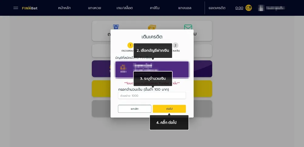 2. เลือกบัญชีเพื่อฝากเงิน โดยจะเป็นบัญชีที่เคยผูกไว้กับ FinnBox