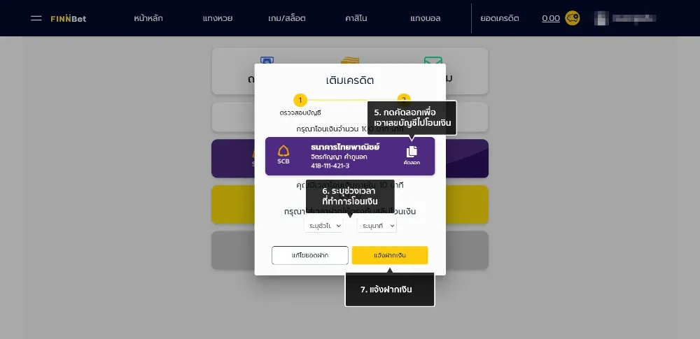 5. กดคัดลอกเลขบัญชี FinnBox จากนั้นไปที่ธนาคารของท่านที่มีการผูกบัญชีไว้กับ FinnBox